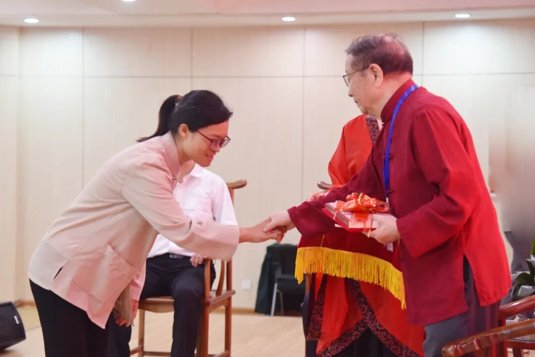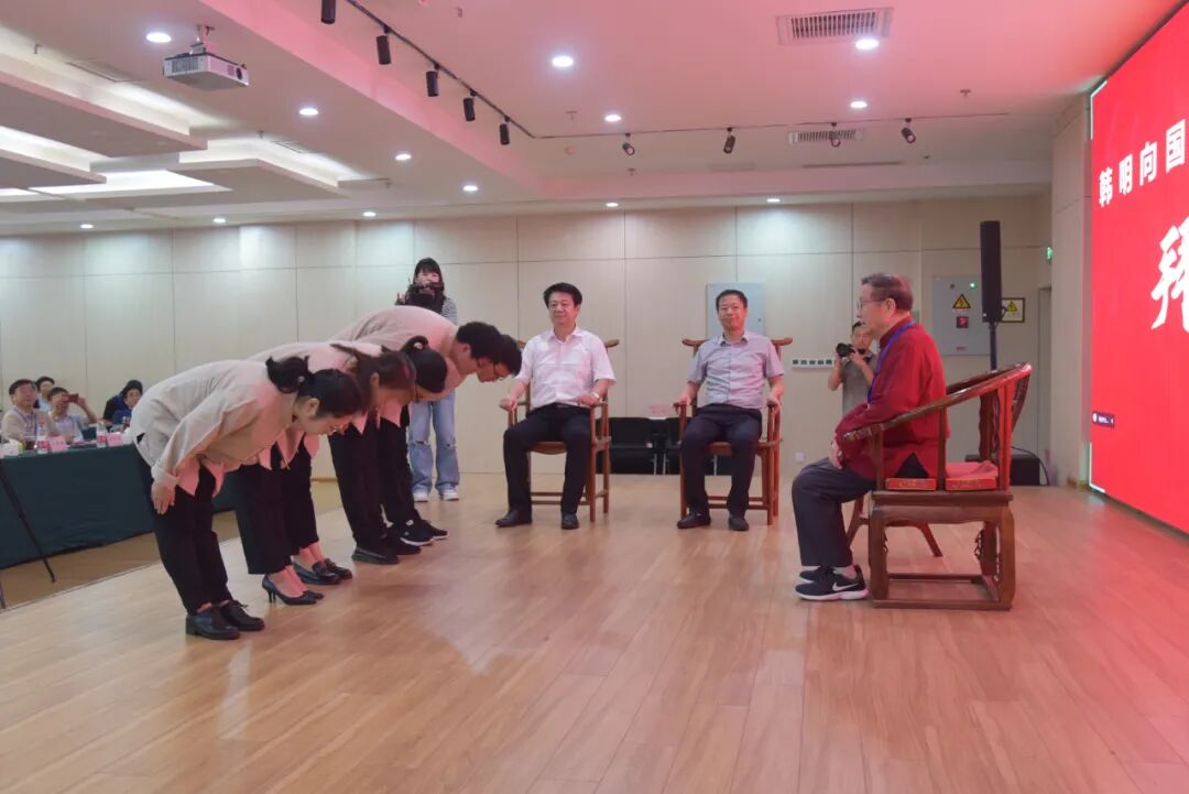 現(xiàn)場(chǎng)舉行了拜師儀式,我院中醫(yī)婦科主任醫(yī)師曲玉芳、肺病科副主任醫(yī)師吳成明,肝病科副主任醫(yī)師杜大平、脾胃病科主治醫(yī)師華明柳、內(nèi)分泌科主治醫(yī)師王劭敏等5名弟子詠?zhàn)x拜師詞、向老師行拜師禮并敬茶獻(xiàn)花。國(guó)醫(yī)大師韓明向向弟子回贈(zèng)收徒帖和首發(fā)新書(shū)。