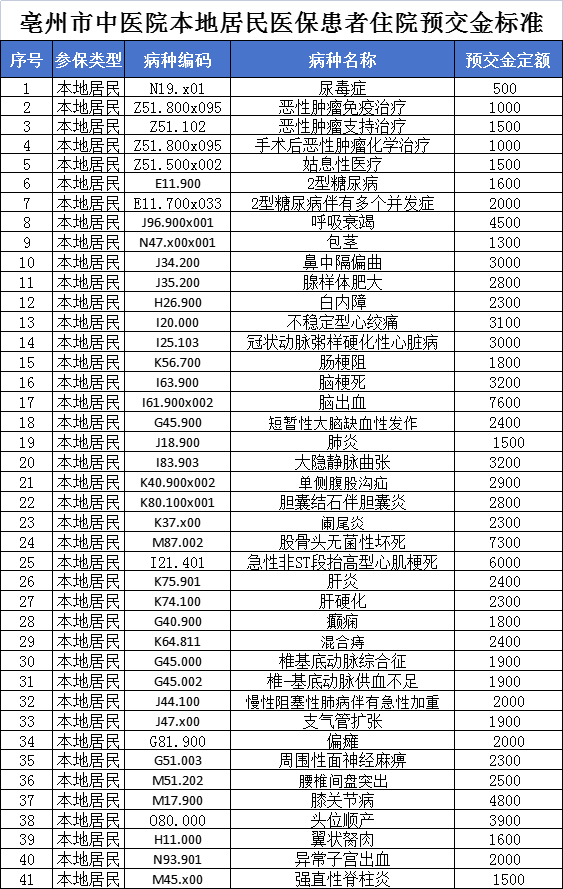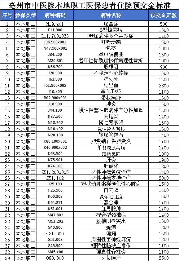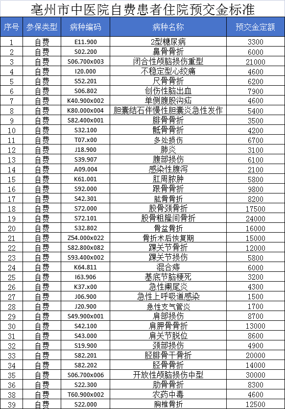 為貫徹落實《亳州市規(guī)范公立醫(yī)療機構(gòu)預(yù)交金管理工作實施細則》工作要求,切實減輕患者就醫(yī)負擔(dān),進一步優(yōu)化服務(wù)流程,我院結(jié)合既往3年歷史數(shù)據(jù)測算,按“本院各病種個人平均自費住院費用”確定了常見病種的住院預(yù)交金額度,特此公示。