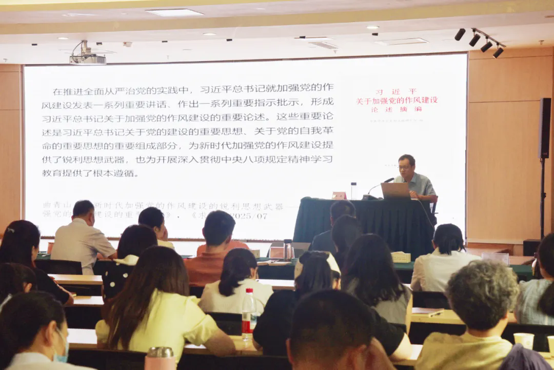 表彰大會(huì)后,亳州市委黨校馬克思主義基礎(chǔ)理論教研室副教授、安徽省委講師團(tuán)專家?guī)旎鶎有v專家朱磊以《學(xué)習(xí)習(xí)近平總書記關(guān)于加強(qiáng)黨的作風(fēng)建設(shè)的重要論述》為主題為大家上了一節(jié)生動(dòng)的黨課。朱磊從重大意義、本質(zhì)屬性、核心要義、重大舉措、重點(diǎn)任務(wù)、“關(guān)鍵少數(shù)”、有效途徑、重要目的、制度保障九個(gè)方面闡述了習(xí)近平總書記關(guān)于加強(qiáng)黨的作風(fēng)建設(shè)的重要論述。